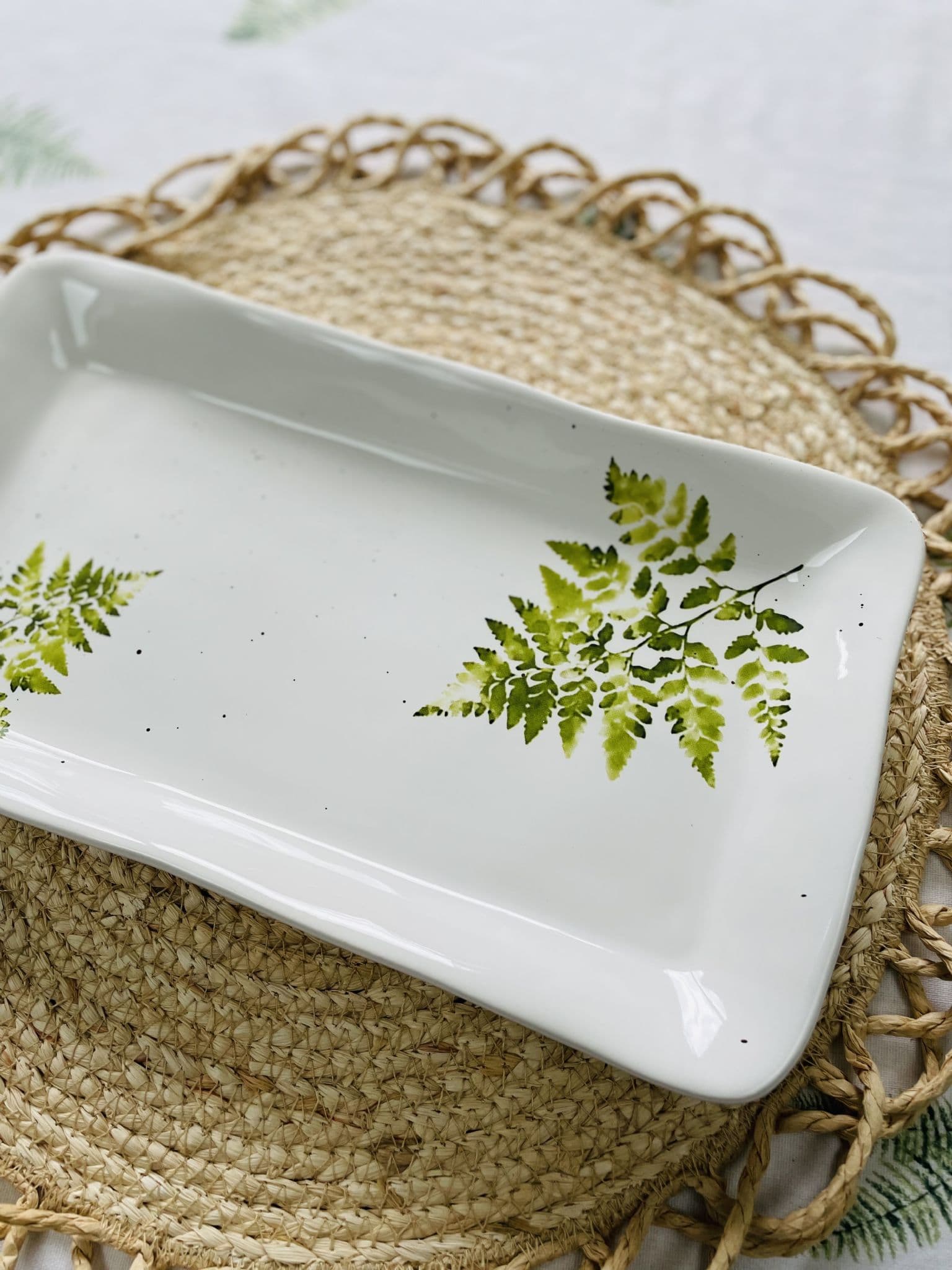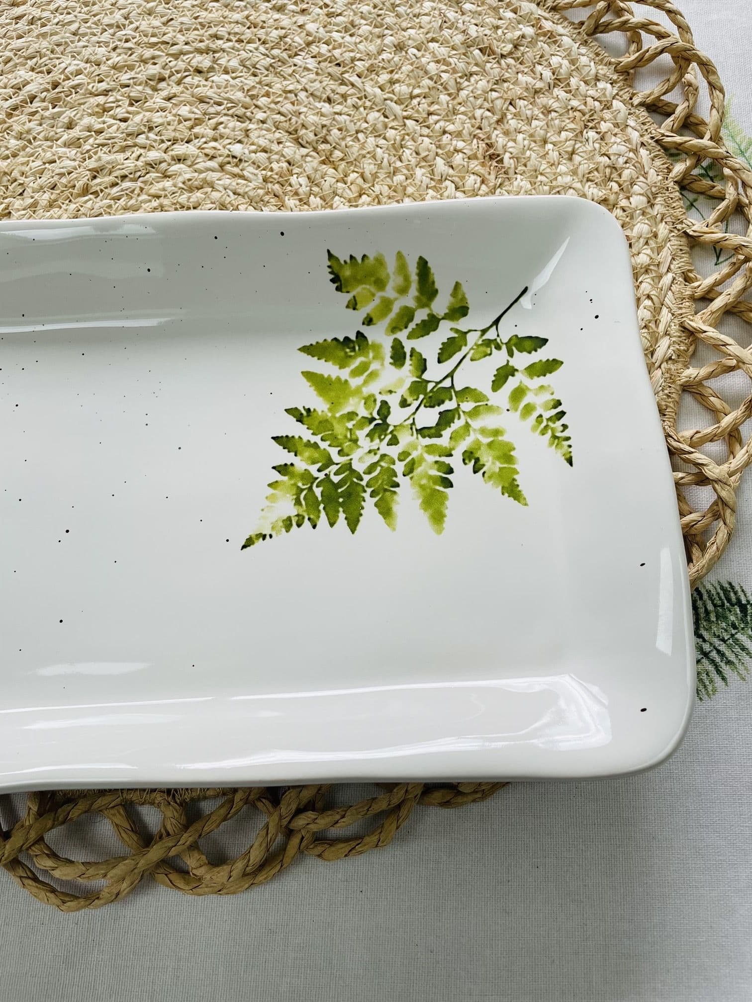 Glazed white ceramic platter with a black splatter finish. A delicate green fern leaf is painted in a watercolour effect.  Gorgeous tableware to style your dinner parties.